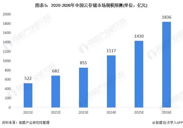 未来,我国5G的发展与云计算交织并进,5G时代网络速度的提升带来万物互联,而其背后大量的数据需要有云计算强大的计算和存储能力支撑,我国云存储市场发展空间大,市场规模在未来几年仍将保持较快的增速增长,2026年有望突破1800亿元。